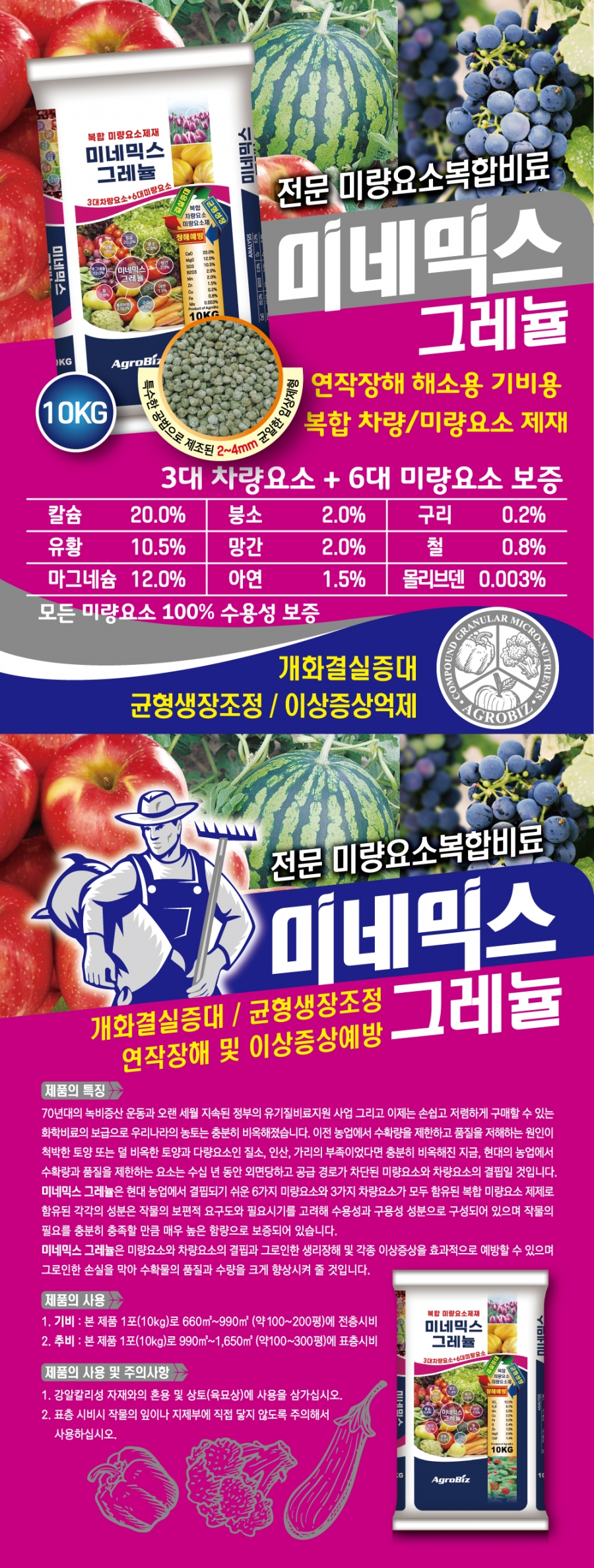 미네믹스 그레뉼은 현대 농업에서 결핍되기 쉬운 6가지 미량요소와 3가지 차량요소가 모두 함유된 복합 미량요소 제제로 함유된 각각의 성분은 작물의 보편적 요구도와 필요시기를 고려해 수용성과 구용성 성분으로 구성되어 있으며 작물의 필요를 충분히 충족할 만큼 매우 높은 함량으로 보증되어 있습니다.