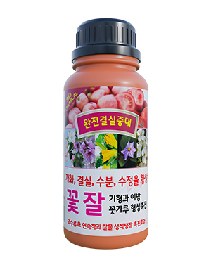 꽃잘은 냉해와 동해로 인한 결실장해를 예방 및 극복하여 꽃눈 / 수분관 / 자방 등의 생식기관을 정상적으로 발달시켜 결실율을 높이기 위해 고안된 고급 완전결실보조제 입니다.