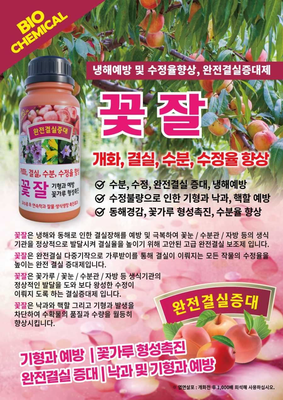 꽃잘은 냉해와 동해로 인한 결실장해를 예방 및 극복하여 꽃눈 / 수분관 / 자방 등의 생식기관을 정상적으로 발달시켜 결실율을 높이기 위해 고안된 고급 완전결실보조제 입니다.